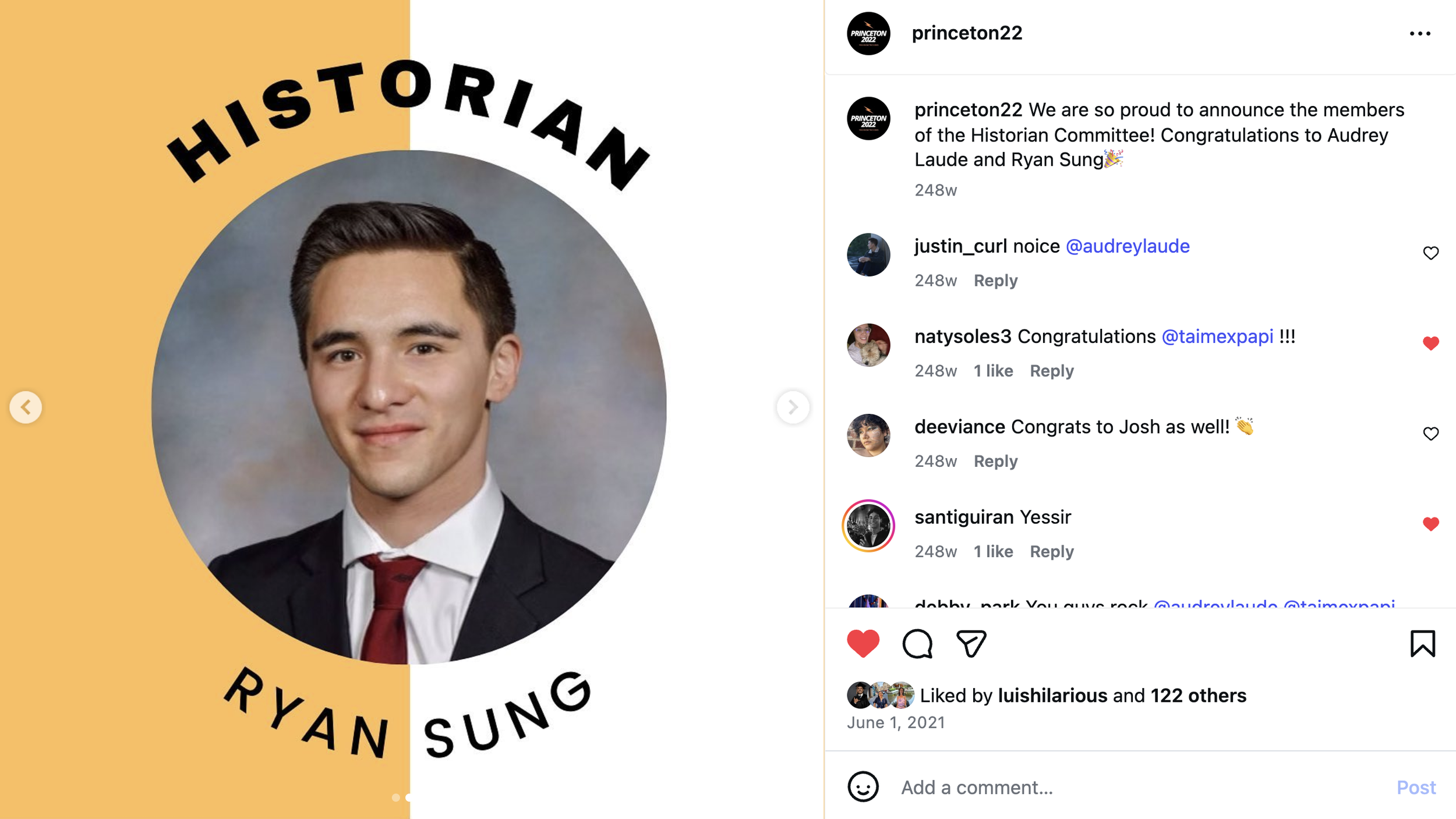 The instagram announcement of my election as the Princeton Class of 2022 Historian!